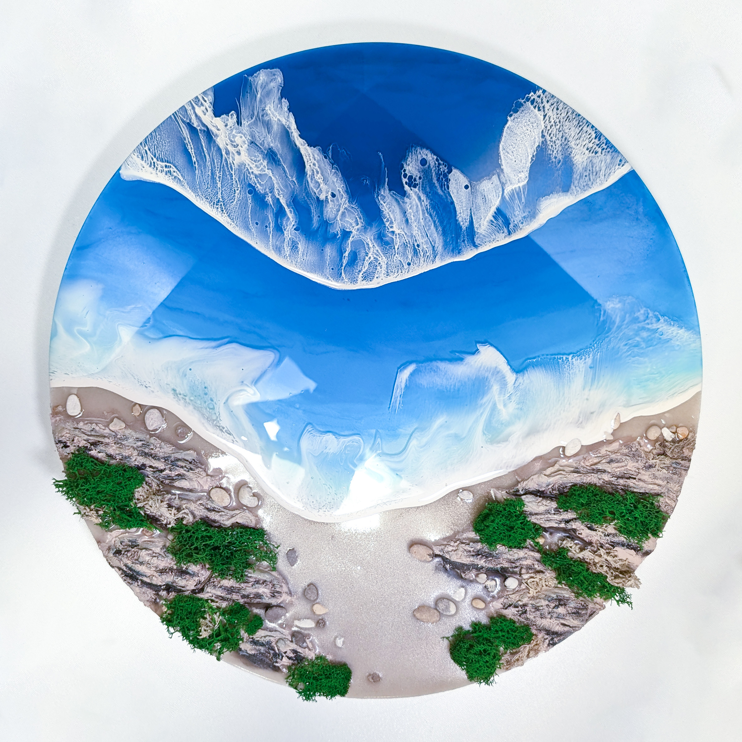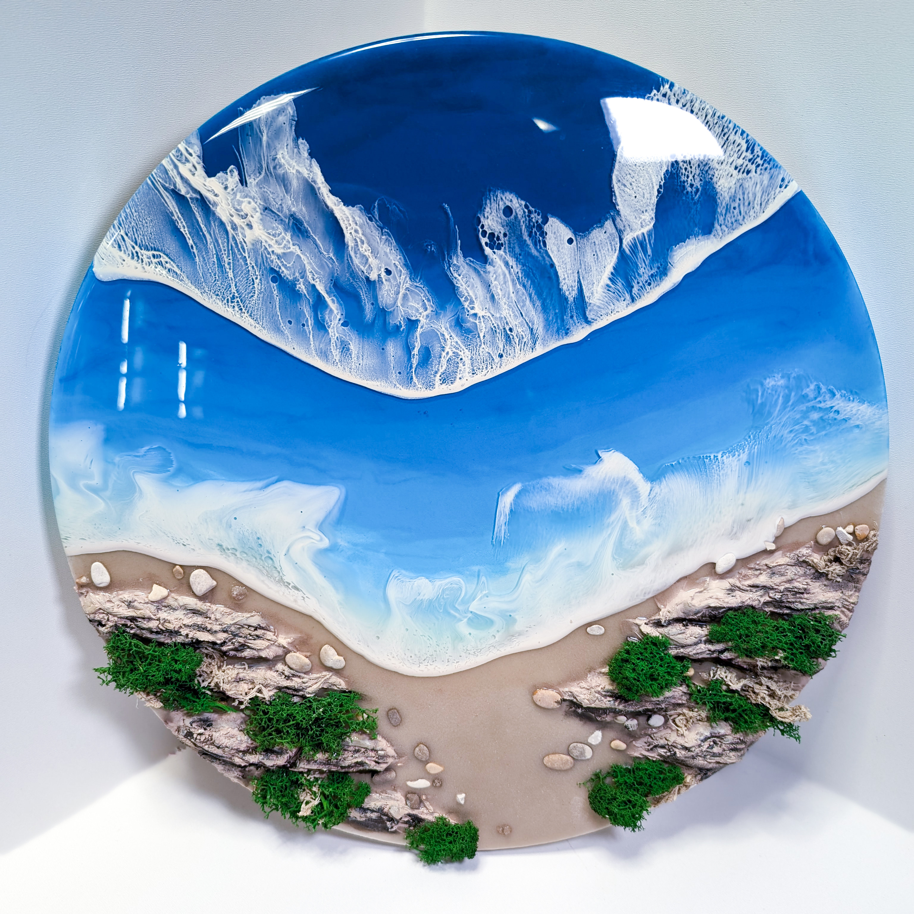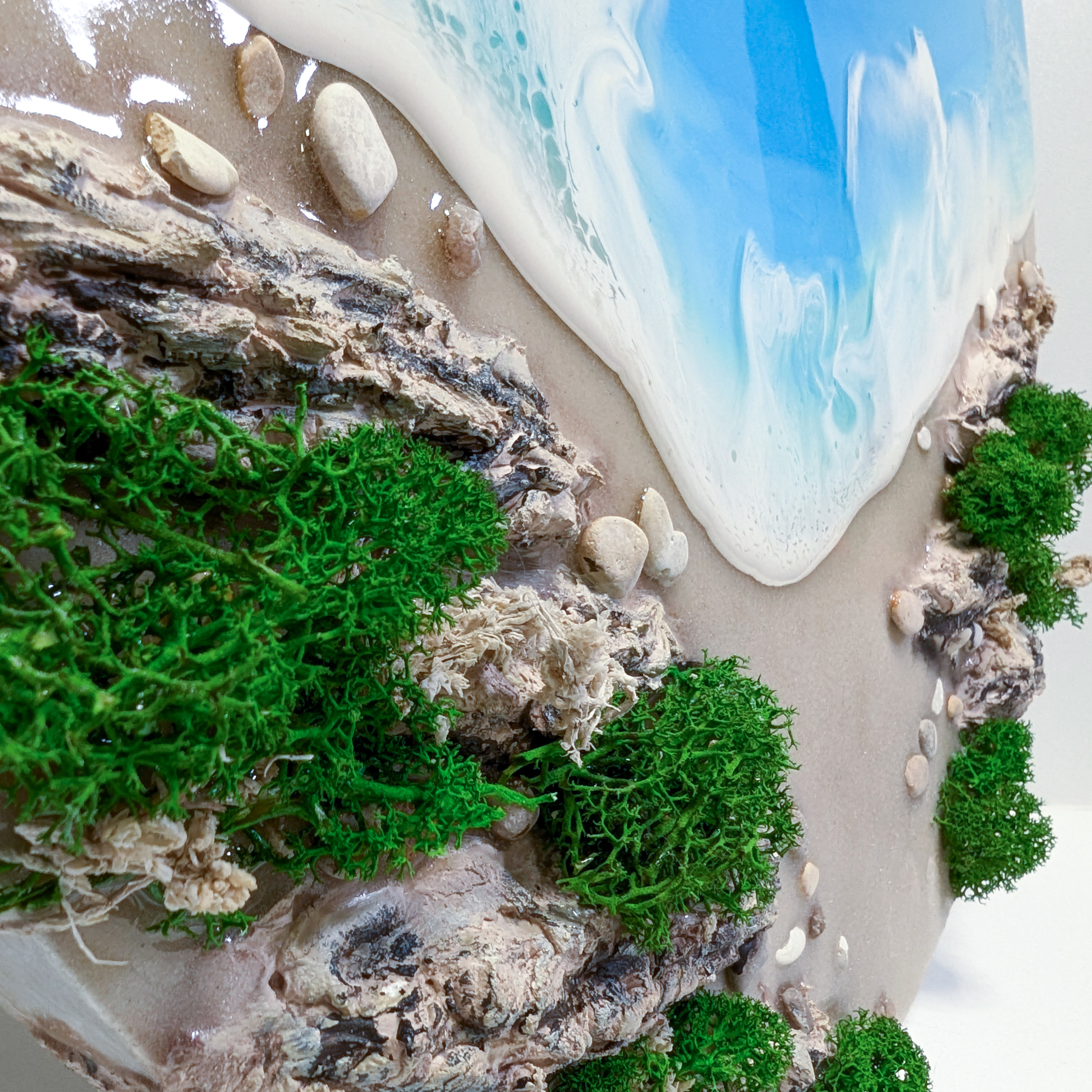 Декоративное панно из эпоксидной смолы, с добавлением кварцевого песка, стабилизированного мха, морских камней, текстурной пасты.